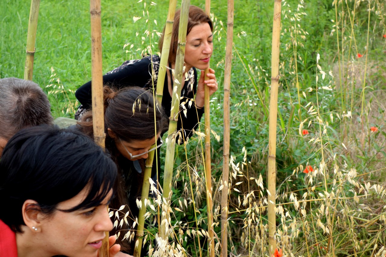 I took a recording of a cane from a canebrake (Arundo Donax) continuously swept by wind. This recording was then filtered in order to turn its noise, from time to time, into a particular frequency. Eight different versions of the soundfile were created. These eight soundfiles were loaded into eight different Micro-SD cards, feeding Vibe-Tribe Troll 2.0 battery-powered vibration speakers. The speakers were attached to eight different dried canes, planted into the soil as to form an artificial sound canebrake. The installation, called Canneto Sonante (sounding canebrake) could be experienced by listening to the polyphony created by the different canes, by putting one’s ear onto the canes (listening to a particular internal background resonance, peculiar to each cane), or touching one or more canes at the same time for a tactile experience.