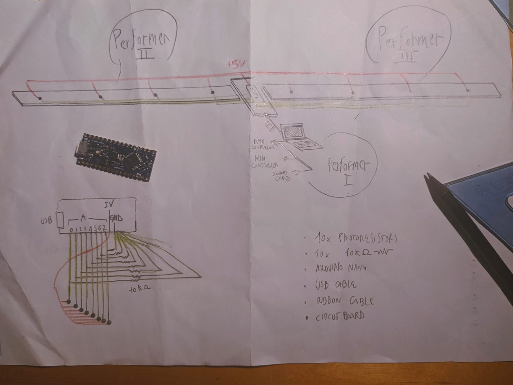 The material was adapted and assembled in collaboration with Lorenzo Colombo, with the kind support by Solistforeningen. The setup includes 8 light sensors, one Arduino Nano Every, a Max8 patch, 8 vibration speakers, 8 water-filled transparent plates, 2 4-channel DMX-controlled relay boxes, 8 LED spotlights.