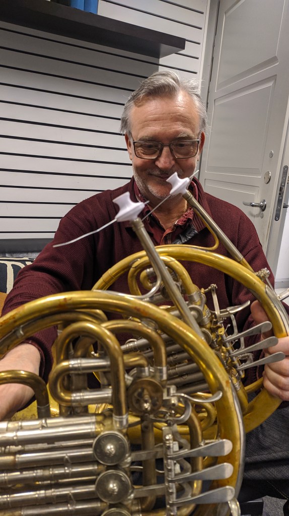 The specially designed 3D-printed mouthpiece serves three purposes: it hosts the kalimba tine (actually a rake’s tooth), allows for what I call “finger-ram”, a miniature version of the palm-ram usually employed as an extended technique for brass instruments, and, most importantly, lets the hornist produce non-pitched sounds of any kind without accidentally emitting a standard tone.