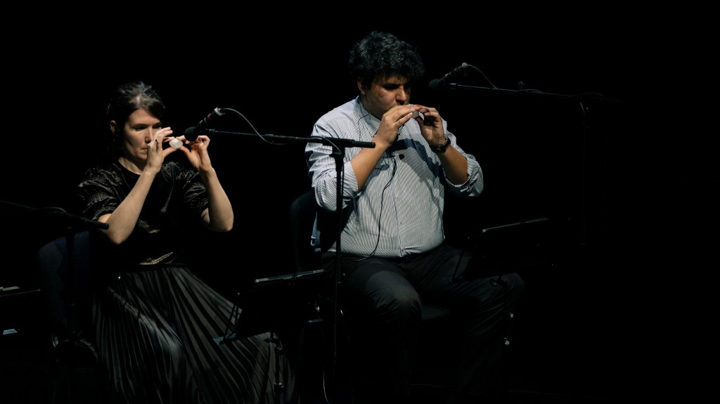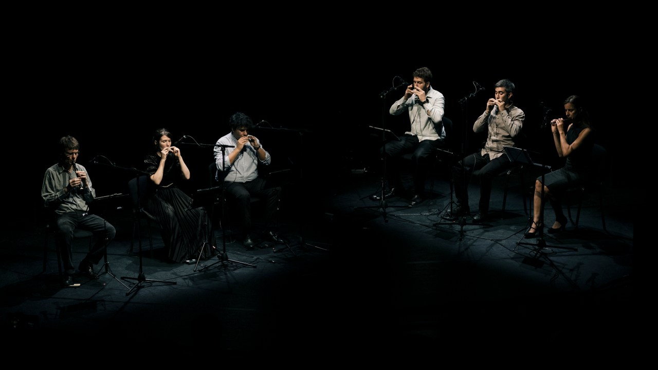 The piece was composed using bird recordings made at the Kilpisjärvi Biological Research Station during a residency organized by the BioArt Society in Finnish Lapland. While trekking along the border of Finland, Sweden, and Norway, I encountered two birds singing as if they were the left and right channels of a stereo track, calling to each other. Polyrhythmic structures were developed from these recordings, with six performers playing at different tempos: some at 97 BPM, others at 80 BPM. The pitch material was also derived from these recordings, expanding the latent harmonies present in the birds’ songs. For this piece, I used 3D-printed ocarinas modified for microtonal tuning, alongside a piccolo and a recorder.