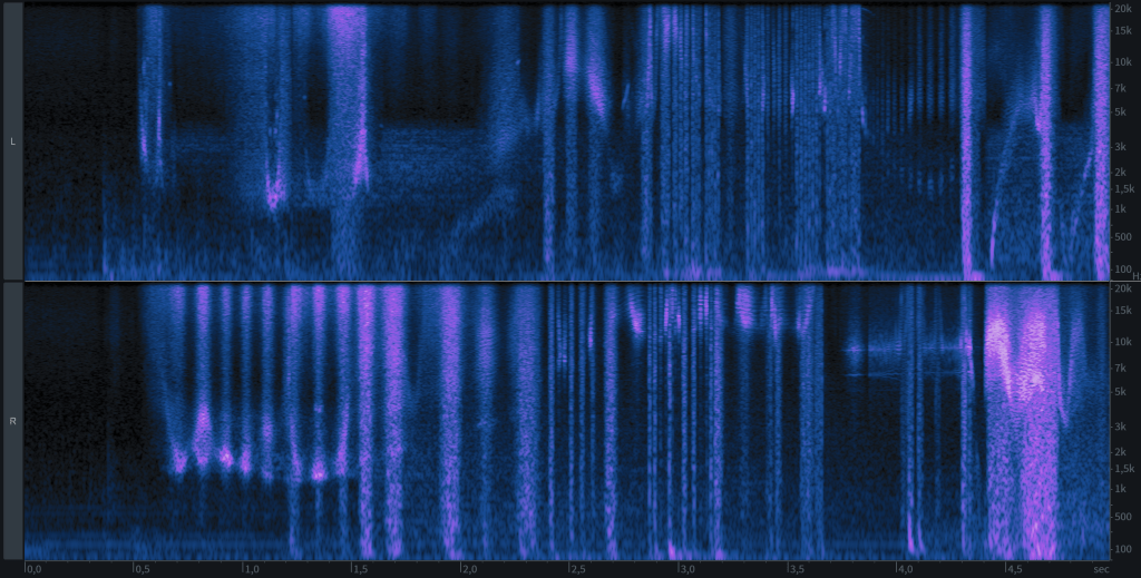 The first element, which we will call A, appears to be produced using fast-sweeping band-pass filters applied to white noise, suggesting a synthetic origin. It is present as two distinct and independent voices located in the left and right channels. Each of the two voices exhibits a very narrow and localized spatiality (they never cross to the other stereo side). This material is harmonically unstable — it lacks a clear fundamental or dominant pitch. From a performative/vocal perspective, it could be imitated by producing a “shhh” sound while shaping the oral cavity, modulating its resonance.