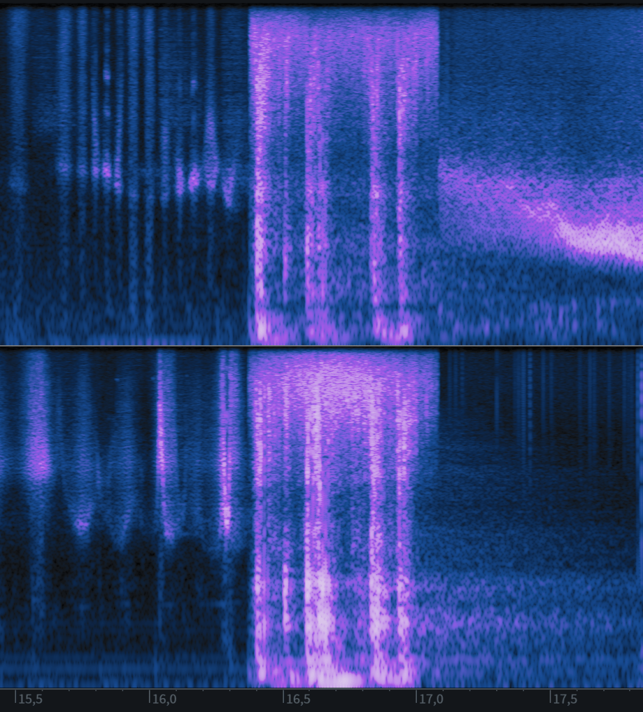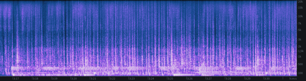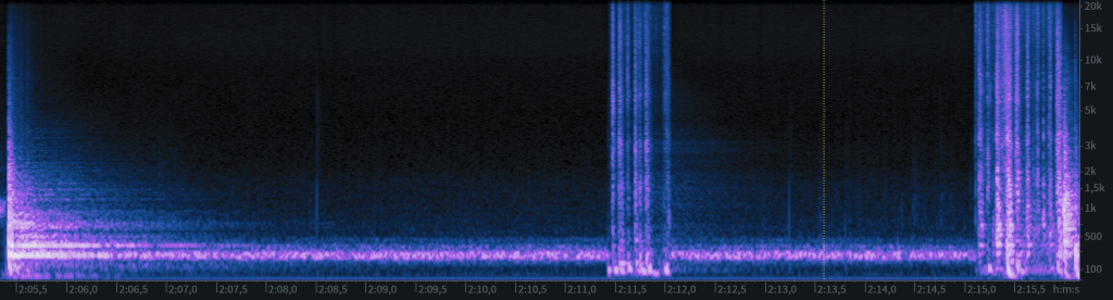 Then, after 3’17” (section two), a transformation occurs: the clear percussive pulse disappears, replaced by a low-frequency band of white noise that recurs at regular intervals, which seems to be a sort of transposed version of the resonances that follows the attacks in Part 2. This new element is rhythmically consistent in its recurrence, but lacks defined attacks — a kind of filtered throb in the low register. It assumes the role of the metronome without explicitly imitating its percussive gestures. Over time, the material begins to accelerate, and the structure gradually crumbles, eroded from within by the increasingly aggressive and distorted outgrowths of the new, hybrid material.