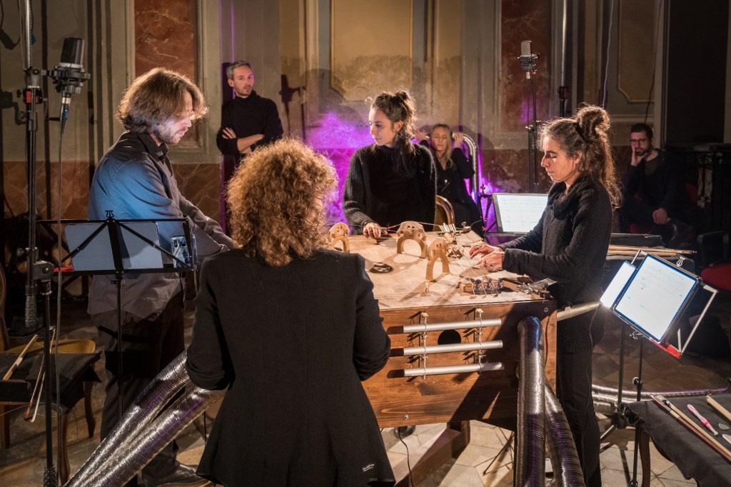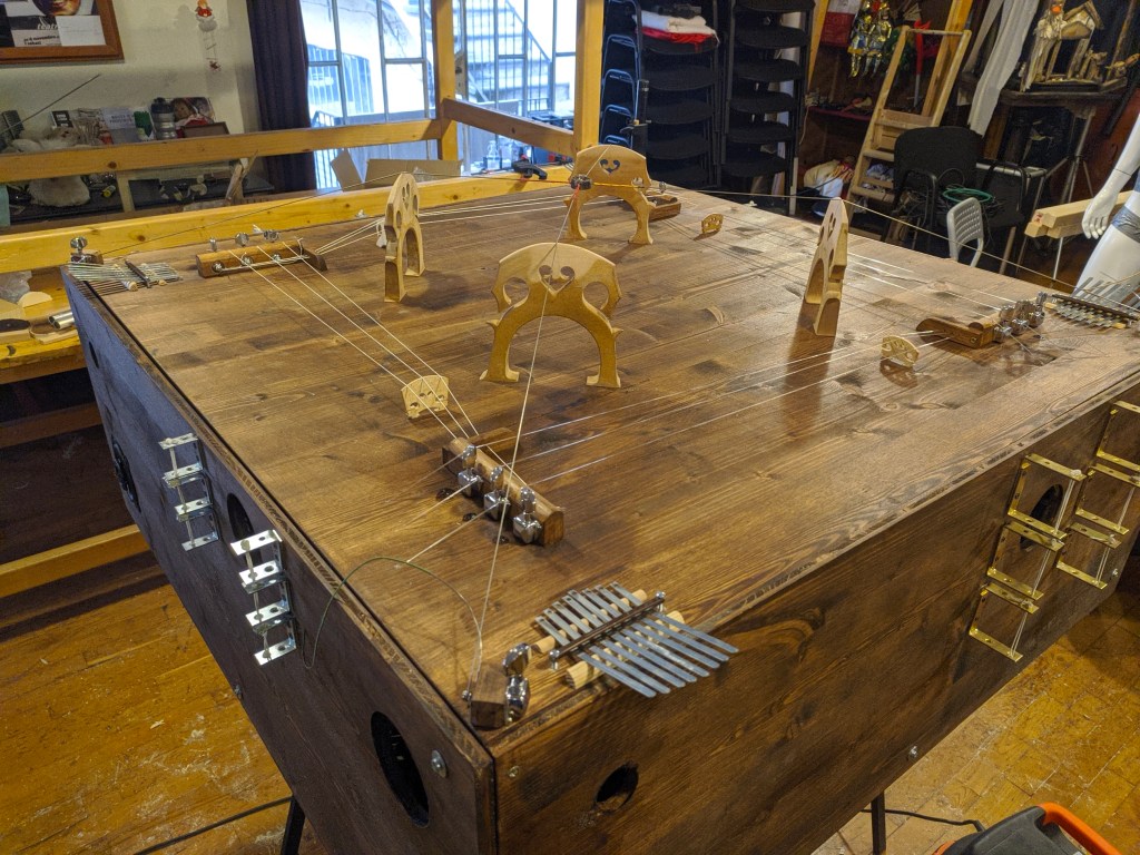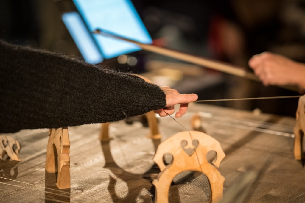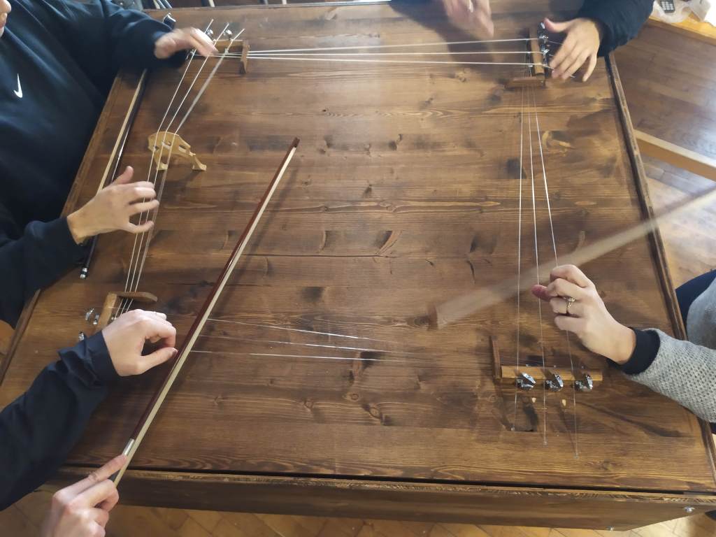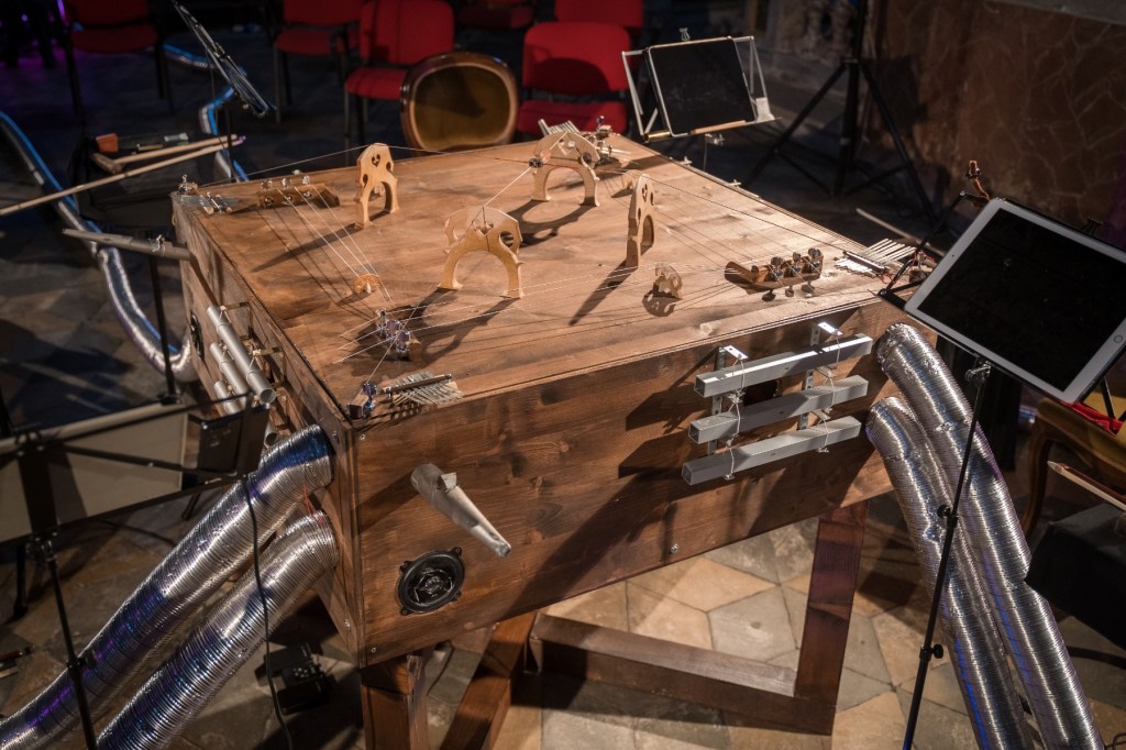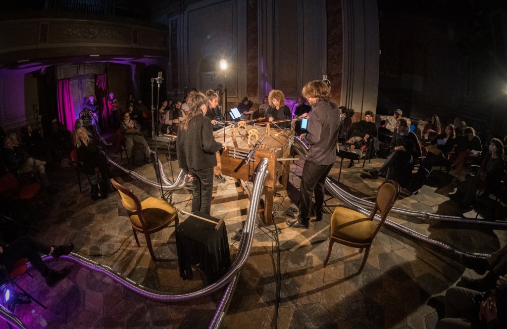 In November 2021 I was in residence in Pinerolo, Teatro del Lavoro, where I built a multi-instrument for Quartetto Maurice. The instrument is a shared wooden box, built taking into consideration the quality of the interplay developed by the quartet during many years of work together. The instrument explores the possibility of diversified experiences of listening for the audience. It is equipped with four cello strings, 12 guitar strings, four kalimbas, 12 aluminum tubes, four speakers for electronic track playback, and four organ pipes. The box also features eight 80mm-diameter flexible aluminum pipes, which allow experiencing the music through an amplifying and filtering medium, by approaching the other end of any pipe with one’s ears. The music performance by Quartetto Maurice can therefore also be experienced in a differently immersive and intimate way.