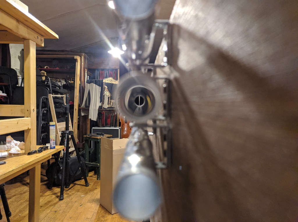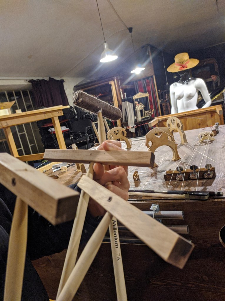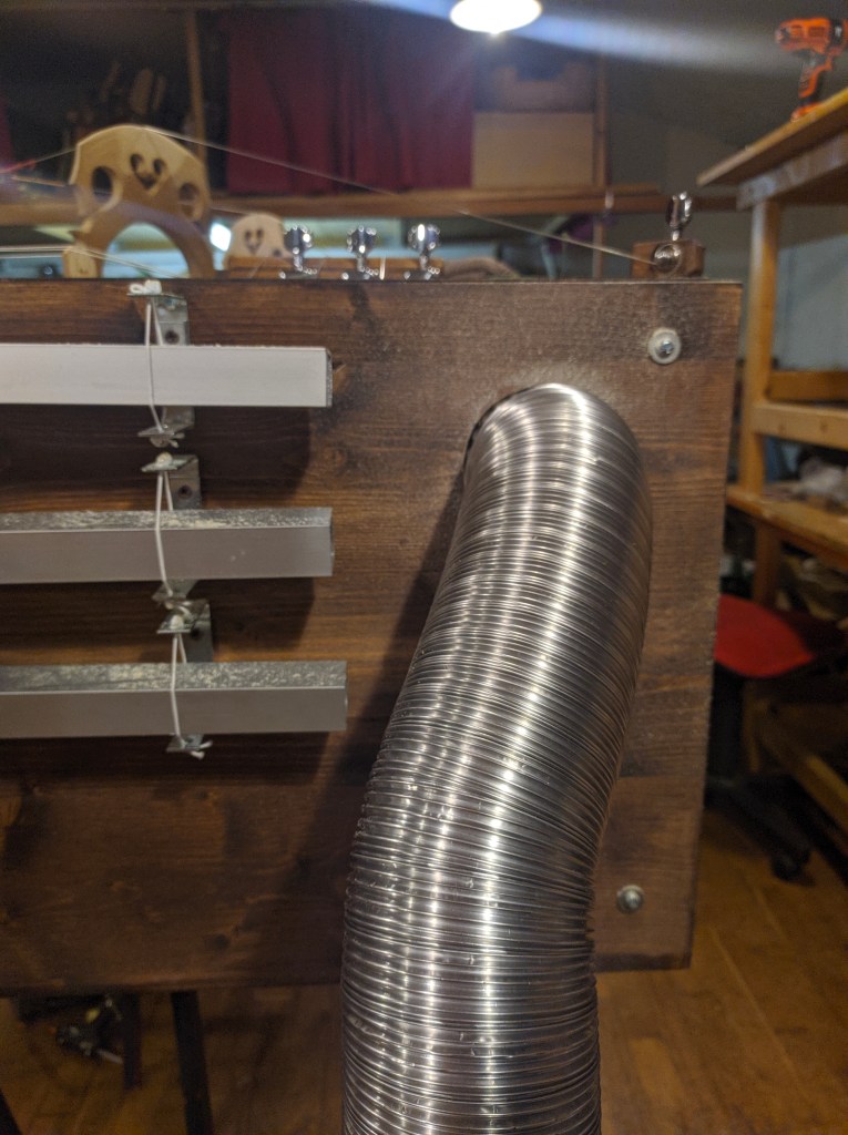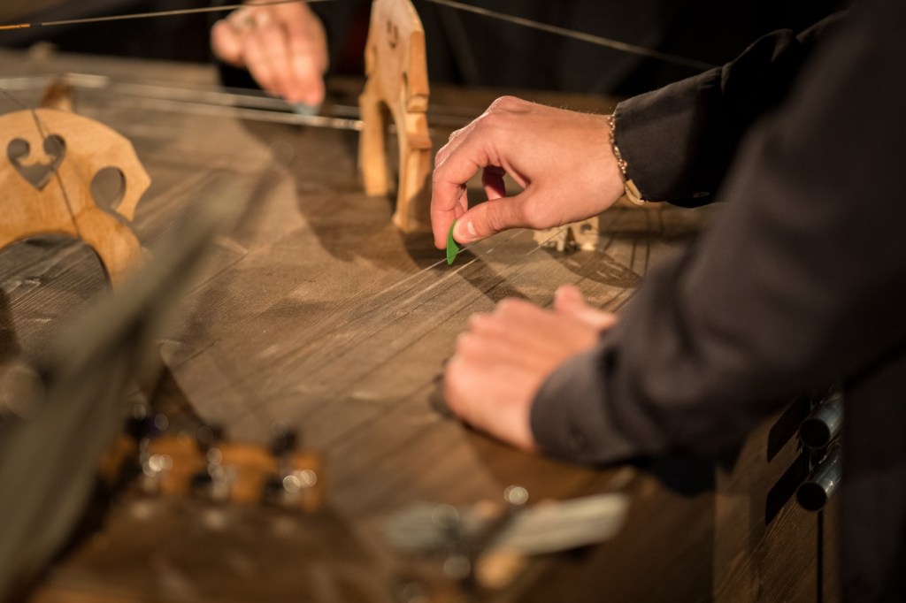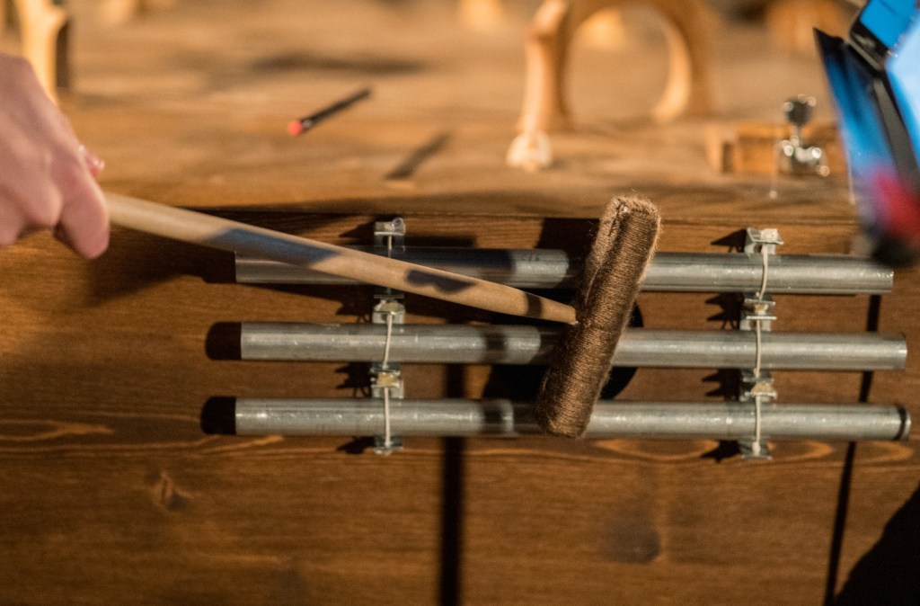 In November 2021 I was in residence in Pinerolo, Teatro del Lavoro, where I built a multi-instrument for Quartetto Maurice. The instrument is a shared wooden box, built taking into consideration the quality of the interplay developed by the quartet during many years of work together. The instrument explores the possibility of diversified experiences of listening for the audience. It is equipped with four cello strings, 12 guitar strings, four kalimbas, 12 aluminum tubes, four speakers for electronic track playback, and four organ pipes. The box also features eight 80mm-diameter flexible aluminum pipes, which allow experiencing the music through an amplifying and filtering medium, by approaching the other end of any pipe with one’s ears. The music performance by Quartetto Maurice can therefore also be experienced in a differently immersive and intimate way.