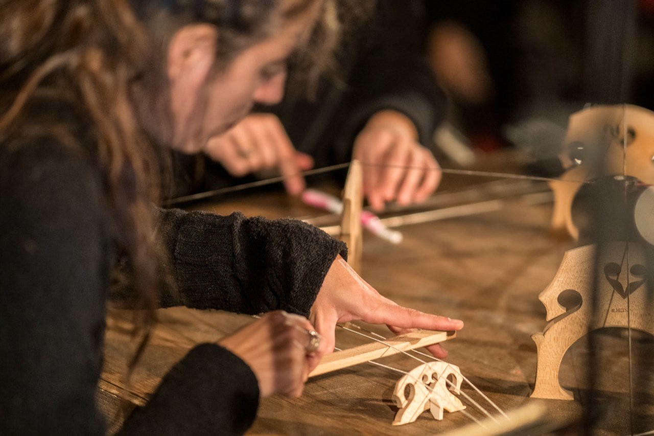 In November 2021 I was in residence in Pinerolo, Teatro del Lavoro, where I built a multi-instrument for Quartetto Maurice. The instrument is a shared wooden box, built taking into consideration the quality of the interplay developed by the quartet during many years of work together. The instrument explores the possibility of diversified experiences of listening for the audience. It is equipped with four cello strings, 12 guitar strings, four kalimbas, 12 aluminum tubes, four speakers for electronic track playback, and four organ pipes. The box also features eight 80mm-diameter flexible aluminum pipes, which allow experiencing the music through an amplifying and filtering medium, by approaching the other end of any pipe with one’s ears. The music performance by Quartetto Maurice can therefore also be experienced in a differently immersive and intimate way.
